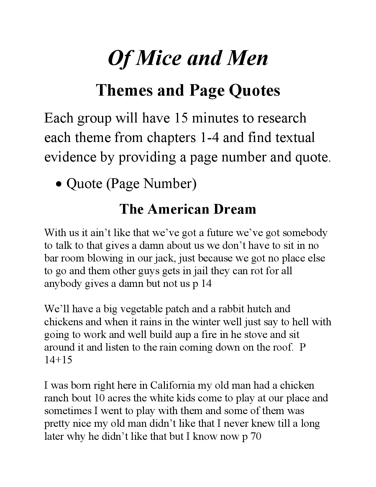 Of mice and men, chapter 2, george to lennie about curley. Litcharts makes it easy to find quotes by chapter, character, and theme. There, george and lennie—and, through them, the readers—meet a fascinating cast of characters. Every damn one of 'em's got a little piece of land in his head. Quotes important quotes explained page 1 page 2 page 3 page 4 page 5 i seen hundreds of men come by on the road an' on the ranches, with their bindles on their back an' that same damn thing in their heads. We assign a color and icon like this one to each theme, making it easy to track which themes apply to each quote below. May 20, 2018 · ~ of mice and men curley's wife quotes "think i don't like to talk to somebody ever' once in a while. But if curley punches him, he is to let him have it. For each quote, you can also see the other characters and themes related to it (each theme is indicated by its own dot and icon, like this one: Jan 24, 2019 · the two central characters in of mice and men are george milton and lennie small, two migrant field workers searching for farm work in southern california during the 1930s. When the book begins, george and lennie have just arrived at a new ranch; The of mice and men quotes below are all either spoken by slim or refer to slim. In of mice and men, steinbeck idealizes male friendships, suggesting that they are the most dignified and satisfying way to overcome the loneliness that pervades the world.